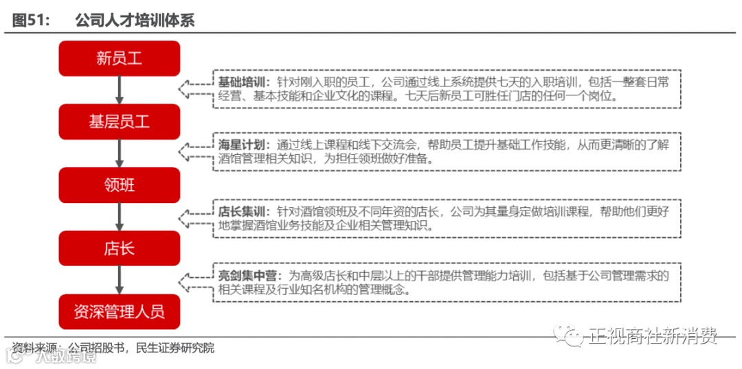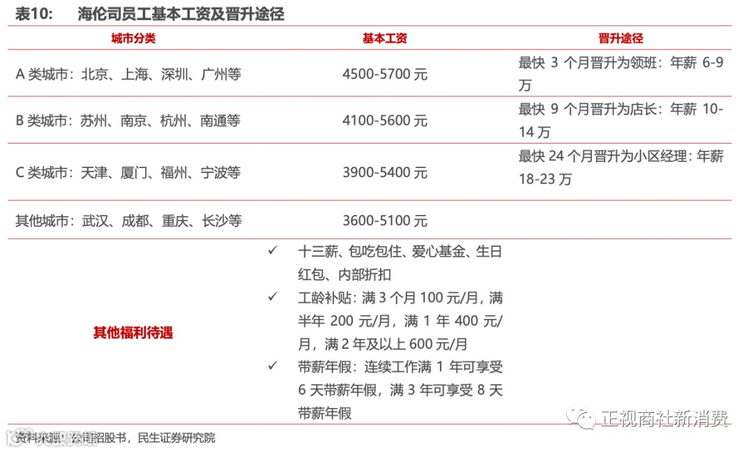 人才培养体系完备,待遇及晋升路径清晰透明。海伦司根据员工层级设计基础培训、 海星计划、店长集训和亮剑集中营 4 项成长计划,店长培养时间缩短至 9 个月, 为持续扩张提供坚实的人才储备。截至 2021 年 8 月,公司店长人数为 554 人, 后备店长人数为 365 人。同时,公司根据城市线级设定薪资及福利水平,待遇标准清晰透明。