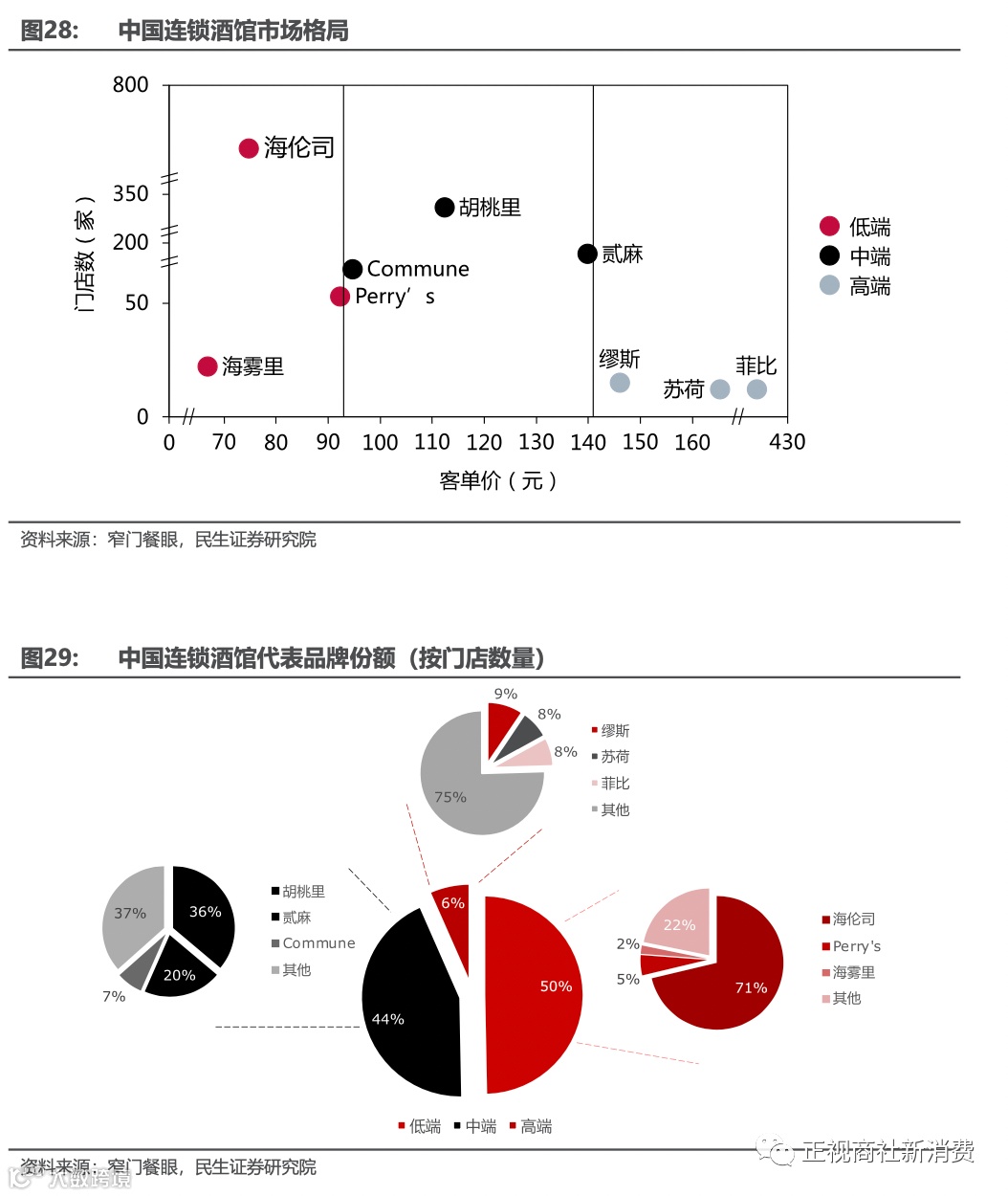 低端、中端连锁酒馆龙头强势,高端市场拓店放缓。进一步细分,我们将主打社交 “第三空间”的连锁酒吧市场按照价格梯度划分为:突出性价比的低端清吧、“以 餐带酒”的中端酒吧以及提供夜生活娱乐的高端夜店。1)低端市场:客单价基本在100 元以下,主打年轻人的夜间平价社交小酒馆。低端市场为酒馆行业最大的细分 市场,2022 年门店数份额占比达 50%。目前海伦司门店数遥遥领先,达 772 家,Perry’s、海雾里小酒馆分别为 65 家/22 家,具有显著的规模梯度,马太效应初显。2)中端市场: 该价格带主要为餐+酒模式的音乐酒吧或餐吧,“以餐带酒”拉高平均 客单价至 100-150 元。头部中端酒吧通过先发优势占领消费者心智,目前根据门店数份额排序的中端酒吧 TOP3 品牌分别为胡桃里/贰麻/Commune,CR3 约63%。其中胡桃里的门店数领先,达 344 家。3)高端市场: 国内高端夜店客单价均价不低于 150 元,连锁门店较少。按照门店数份额,CR3 约为 20%,集中度相对较低。