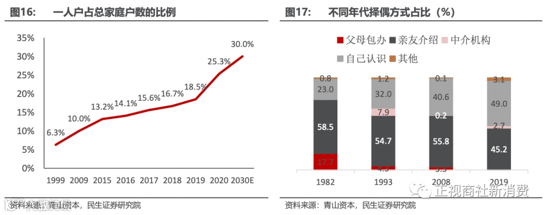 小酒馆精准定位线下半熟人社交场景,满足年轻独居人群的陪伴需求。随着社会观 念愈发开放包容,独居成为年轻一代的越来越多的选择。根据青山资本数据,2021年中国已到适婚年龄的单身人口达到 2.4 亿,独居人口达 9200 万,超过 1/4 的家 庭为一户。独居时代之下,个体连接与社区意义随之发展,悄然催生新的社交状态。从交友择偶观念来看,年轻群体认同更加自由自主的恋爱交友观。据艾媒咨询,不 着急恋爱/享受单身生活成为中国网民单身的首要原因。从交友择偶方式来看,2019 年适婚人群择偶方式中自己认识/亲友介绍分别占 49%/45.2%,说明单身年 轻群体更倾向借助自由搭讪、半熟人社交等方式创造人际连接,满足陪伴及择偶需要,小酒馆正是为年轻独居人群提供了适宜的社交场域。