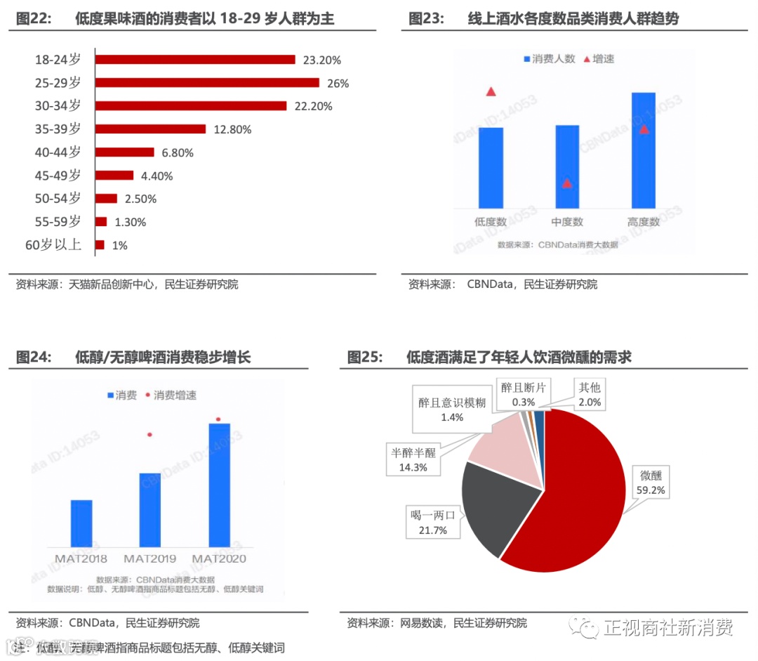 小酒馆发力低度酒产品,迎合年轻消费者的微醺、适口需求。低度酒消费客群以18-29 岁的年轻群体为主,崇尚自主掌控、好喝享受的新酒精生活方式。年轻人普 遍存在健康焦虑,期望健康值与实际健康状态差距较大,饮酒观念更为理性,推崇 “适量饮酒”、“健康微醺”的酒桌文化,偏爱果酒、啤酒等低度适口酒。根据CBNData 消费大数据,2018-2020 线上低度数酒水的增速远高于中高度酒水,低醇/无醇啤酒在 90/95 后中稳步增长。根据网易数读《当代年轻人轻饮酒调查报 告》,约 60%的年轻人认为微醺是最舒适的饮酒状态,可以满足社交聚会需求,打发无聊、疲惫的时光,找到情绪和压力的释放出口,是一种生活方式。健康化的低度果味酒饮驶入快车道,与年轻人的饮酒消费方向契合,成为拉动酒馆行业发展的增长引擎。