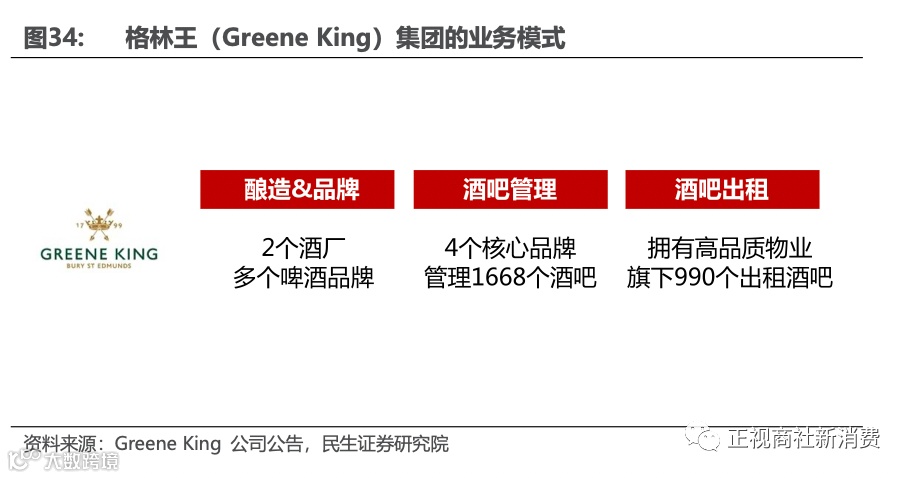我们以市场集中度最高、发展最成熟的英国酒馆行业为例,对标英国大型连锁酒吧 集团格林王(Greene King)。格林王为英国老牌连锁酒馆(Pub),2019 年被长 江实业集团收购。格林王的主营业务为酒吧管理、酿造及品牌和酒吧出租,三大业务互相补充,形成纵深一体化的酒水产业链。格林王拥有 4 个核心酒吧品牌,门店数达 1,686 家,通过差异化的品牌矩阵,覆盖多层次的消费群体,满足消费者的多元需求,先发优势和规模优势明显。格林王酒吧以提供自酿酒水为主、辅以少量种类小食,供应链相对单一、较易标准化。格林王旗下的 2 个酿酒厂,在保证产品质量的同时,提升了品牌知名度。自酿酒水除在格林王酒吧售卖外,还在第三方酒吧及电商平台分销,形成了多渠道多业态的品牌效应。酒吧出租产生的现金再投 资于酒吧管理与酒水酿造,形成了门店地产投资、酒水酿造、酒吧销售的再生产闭环,产业链协同效应显著。参考格林王酒吧的发展情况,在致力产业协同、打造自有酒水品牌方面,海伦司有望借鉴格林王的经验实现单店营收的进一步提升。