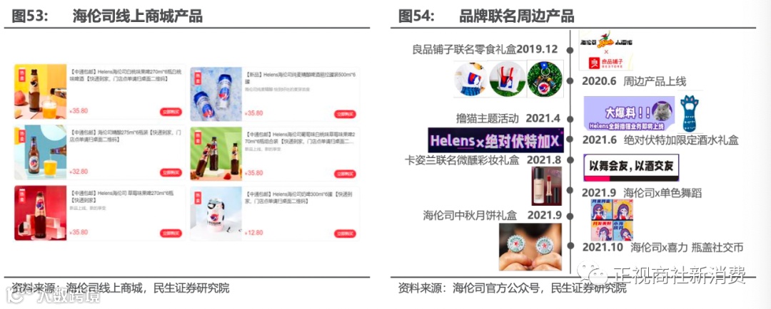 线下门店优化服务,线上商城拓宽渠道。借助智能化应用,海伦司不断优化服务, 实现门店智能化点单,并推出微信直营商城和淘宝旗舰店延伸消费情景。2021 年 海伦司上线在线取号功能,顾客可有效避免排队高峰,减少排队时间从而优化消费 体验。门店还进一步推出打包桶服务和“存酒”服务,店内未消费完的酒饮可以打 包带走或在公众号存档后免费保存 15 天。
