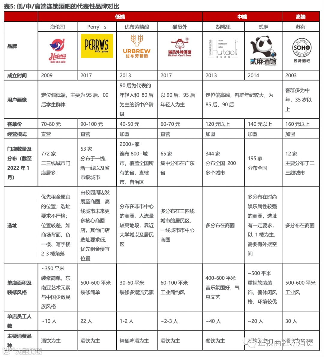 低/中/高三个价格档市场形成差异化竞争。1)低端:平价小酒馆定位普适性最强, 对应需求差异大,覆盖市场广阔。小酒馆对于物业、单店投资额要求较低,选址集 中在客流量较大的学校/商圈附近,以酒水为主打产品精准切入年轻群体夜间社交 场景,依托高效供应链实现极致性价比,最容易形成规模优势。2)中端:音乐酒吧或餐吧对物业、选址有一定要求,驻唱歌手的数量及稳定性掣肘连锁扩张。3) 高端:高端夜店仍属于重资产模式,尤其在疫情冲击下,单店投入成本高,且夜店客群相对较小,客单价偏高,消费频次低,仅少数高线消费活跃度高的城市能够支撑夜店运营,综合来看难以形成规模效应。
