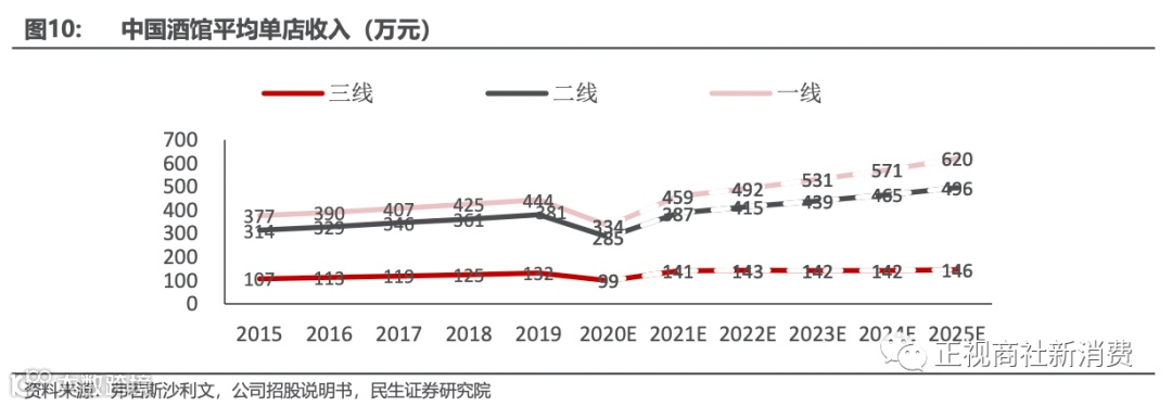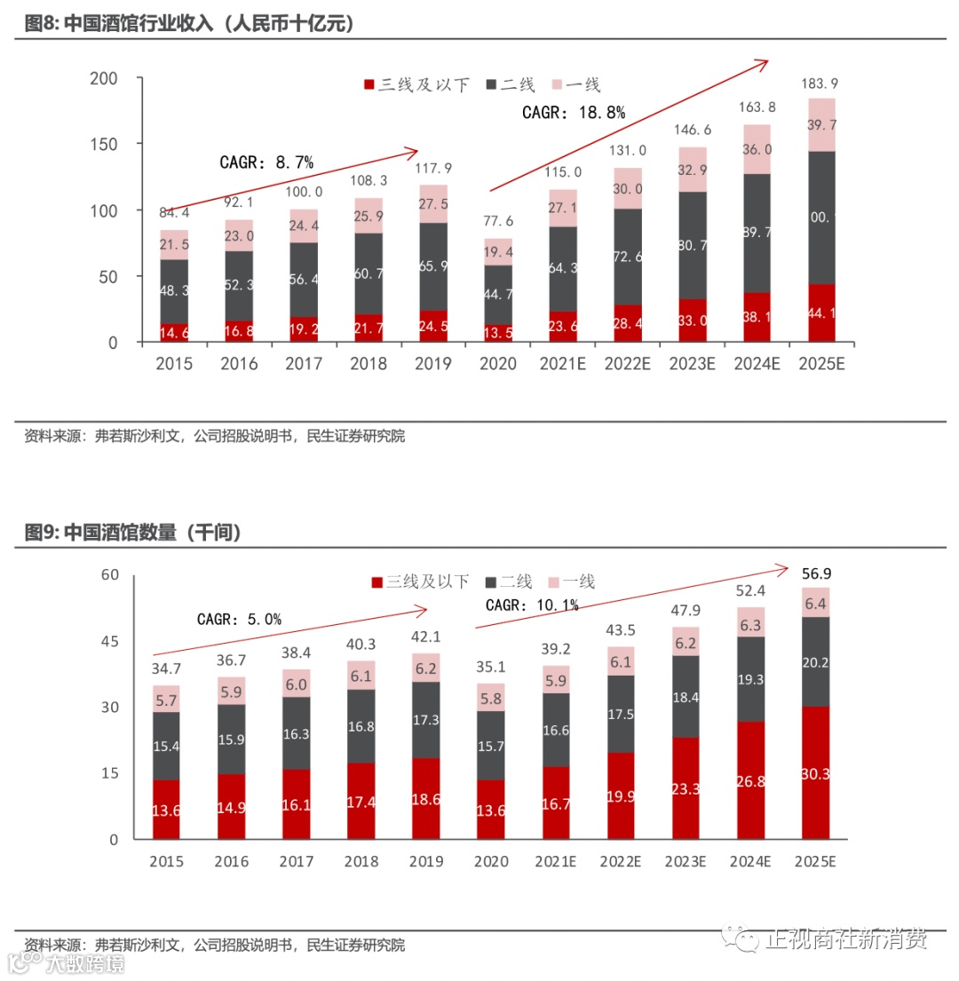 根据弗若斯特沙利文,酒吧行业未来 5 年内门店数 CAGR 达 10.1%。一线/二线/三线及以下城市分别以上海/武汉/宜昌作为标杆城市,我们参照线性回归的思路, 计算各城市与标杆城市人均 GDP/人均覆盖社零/普通本专科学生人数比,并分别赋予人均 GDP 比/人均覆盖社零比/普通本专科学生人数比 20%/40%/40%的权重,测算出门店系数;通过门店系数*标杆城市门店数计算出各城市相对于标杆城 市当前门店数量的理论容量,可得中期全国理论开店空间。