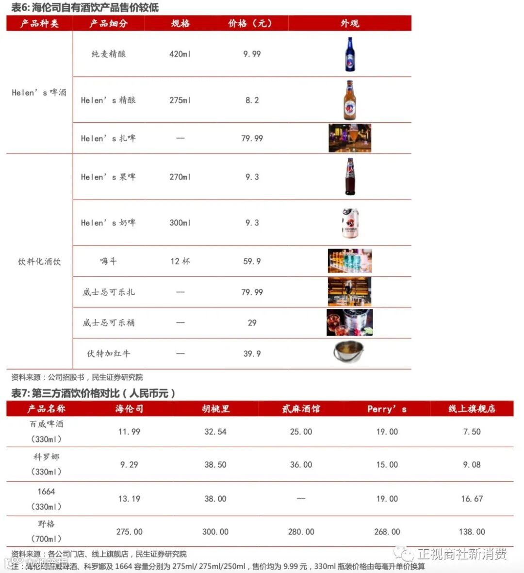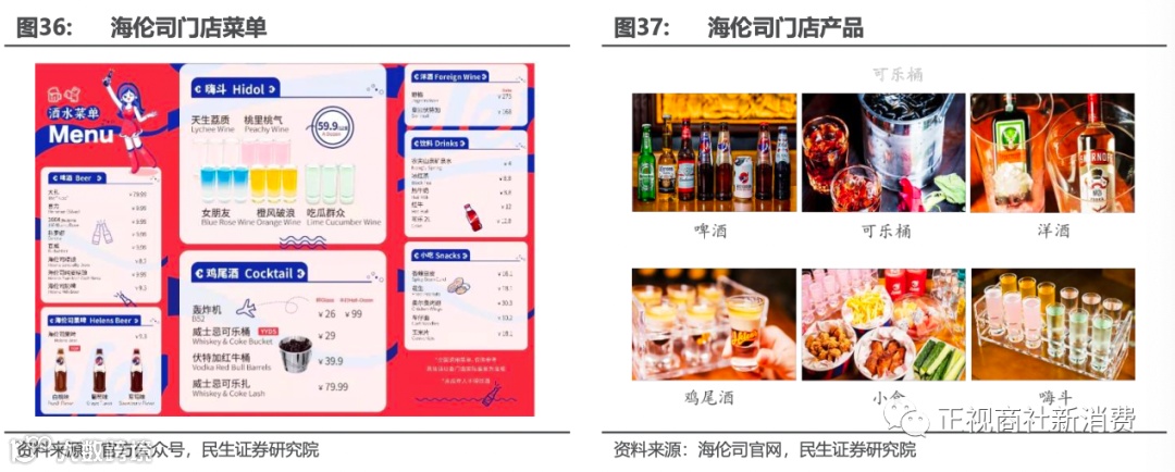 打造极致性价比,直击年轻客群需求。海伦司切中目标客群价格敏感度高的特点, 门店产品价格均低于市场平均,相比胡桃里、贰麻、Perry’s 更具竞争优势。店内 瓶装啤酒售价均低于 10 元,海伦司精酿、奶啤、果啤等自有产品向顾客提供多元 化选择。第三方品牌啤酒百威、1664、科罗娜售价均为 9.99 元,低于同行 35%以上,强化“极致性价比”的品牌认知。