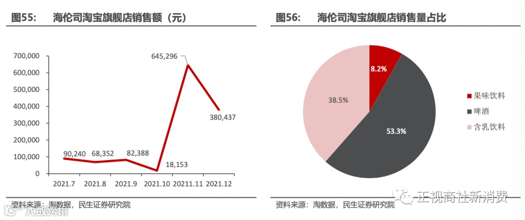 打通线上销售渠道后,海伦司能够直接接触更加广泛的消费群体,进一步扩大品牌 影响力。截至 2021 年 12 月,淘宝旗舰店共上线商品 25 款,啤酒销量占比 53.3%, 双十一活动加持下 11 月旗舰店销量迅速提升,2021 年 7 月至 12 月平均月销售 额 21.4 万元,补充线下营收。