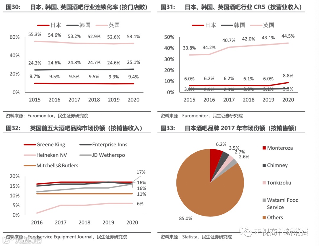 对标海外成熟酒馆市场,龙头连锁酒馆有望脱颖而出。连锁化维度看,2020 年日 本/韩国/英国酒吧行业连锁化率分别达 9.4%/25.1%/53.1%,对标之下中国酒馆 行业连锁化率提升空间较大。集中度维度看,日本/韩国/英国酒吧行业 CR5 稳步 提升,2020 年分别达到 8.8%/3.3%/44.5%,成熟酒馆市场向少数连锁龙头集中。参考海外酒吧行业发展状况,中国头部连锁酒馆有望借助先发规模优势和和品牌 效应加速扩张,提升市占率和渗透率,带动连锁化率提升。
