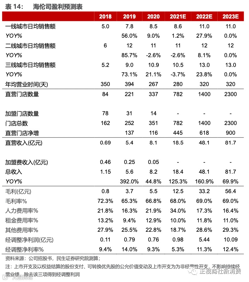 单店日销额:以公司不同线级城市的单店销售额为基础,考虑疫情扰动的影响。我们预计 2021 年海伦司单店日销额与 2020 年整体维持稳健,但由于新开店数大幅提升并受疫情扰动影响,预计 2021 年年均营业时间仍然有所承压。2022 年后随着海伦司品牌效应不断扩增,叠加夜间经济消费市场趋势向好,整体单店日销有所增长。