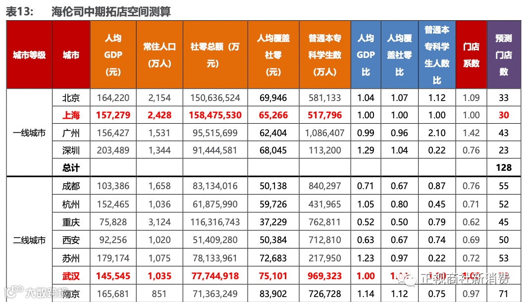 通过上述公式,我们测算出中短期内海伦司在全国各等级城市的拓店空间为3037 家,其中一线 128 家,二线 1784 家,三线及以下 1126 家。