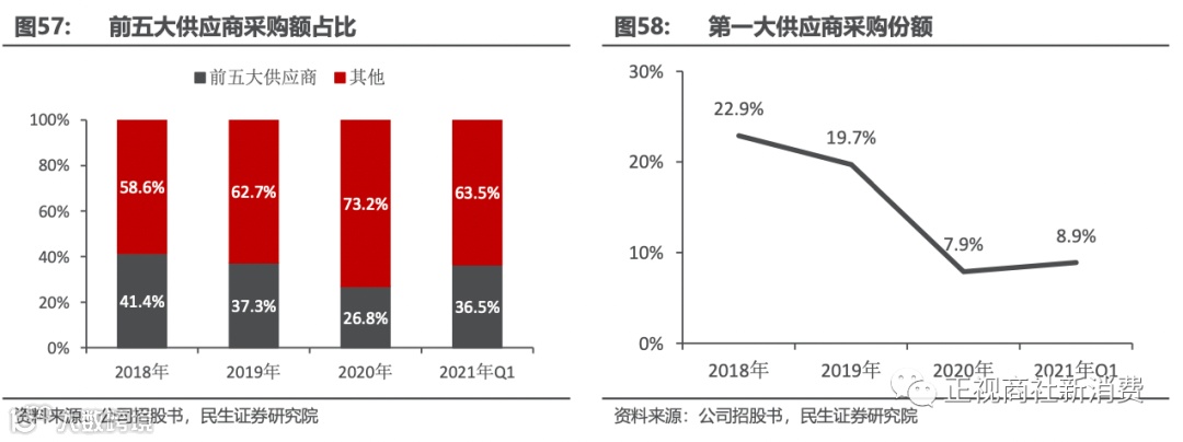 集中采购议价能力强,低成本获取优质产品。公司采用集中采购模式,规模化订单 控制成本,同时稳定质量及产品供应。高级管理层中独立董事王仁荣曾任百威投资 有限公司主席、百威执行董事,在高管履历背景加持下,公司供应商资源更加丰富, 议价能力得到有效提升。为避免过度依赖单一供应商,2018 年以来海伦司逐步扩 增货,2018-2020 年前五大供应商采购额占比分别为 41.4%/37.3%/36.5%,第 一大供应商份额从 2018 年的 22.9%降至 2021Q1 的 8.9%。通过样品测试和半年 期考核,公司得以甄选资质更优的供应商,有效保障产品质量,随着品牌效应深化, 公司议价能力将在未来不断提升,采购成本有望进一步优化。