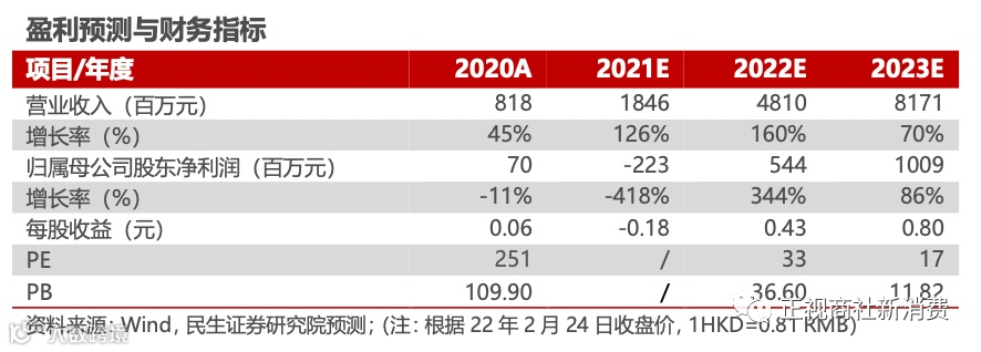 综上,海伦司2021-2023年预期收入分别为18.5/48.1/81.7亿元,同比增长125.3%/160.9%/69.9%,经调整利润为0.98/5.44/10.09亿元,对应利润率为5.3%/11.3%/12.4%。