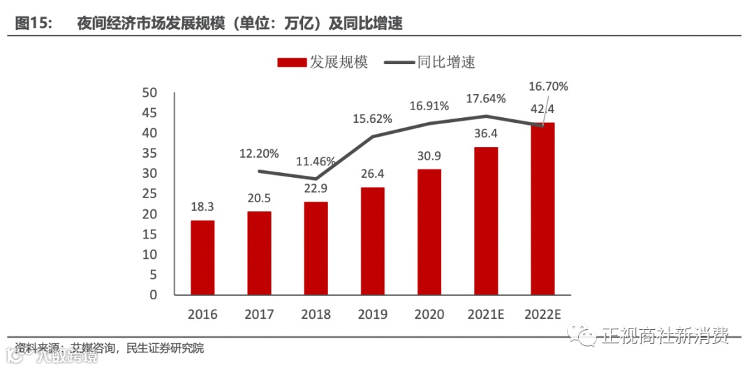 夜间经济规模不断扩大,区域性明显。从整体规模来看,据艾媒咨询,2016-2020年国内夜间消费规模自 18.3 万亿元提升至 30.9 万亿元,年复合增速为 14%。随着消费场景增多、夜间活动更为丰富,2022 年夜间经济规模预计将达到 42.4万亿元。根据腾讯联合瞭望智库发布的《2019 年中国城市夜经济影响力报告》,夜间消费贡献占比达到 60%。