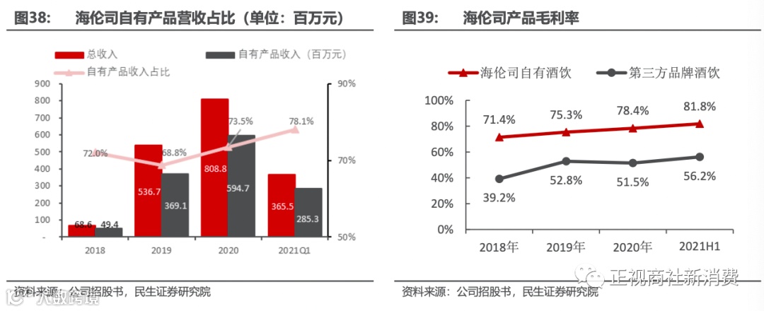 自有产品毛利率高,营收占比不断扩增。连锁直营模式下,海伦司实现门店统一供 应,第三方品牌酒饮由公司集中采购,有效控制成本。自有酒饮采用 OEM 模式代 工生产,利润空间远高于第三方品牌酒饮,2019/2020/2021H1 自有产品毛利率 分别为 75.3%/78.4%/81.8%,同期第三方品牌为 52.8%/51.5%/56.2%。2018 年 以来,自有产品营收占比持续扩增,2021Q1 占总收入的 73.5%、占酒饮类收入74.8%,推动利润率持续走高。另一方面,自有产品和第三方酒饮形成低成本的产 品矩阵,强化海伦司在性价比路线上的竞争优势。