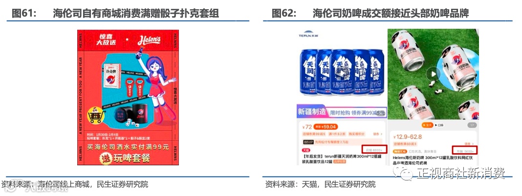 除门店扩张外,海伦司依托不断提升的供应链能力和品牌力,积极布局新零售电商渠道,二次成长曲线可期。产品上线自有的微信商城以及天猫、京东、拼多多等第三方电商平台,价格较店内更为优惠。2021 年 3 月公司天猫旗舰店上线,目前粉丝数已达 5.6 万。目前电商渠道以自有品牌果啤、奶啤、精酿三大系列为主,辅以进口第三方品牌酒饮,包括野格、1664、科罗娜等。海伦司奶啤天猫月销量接近头部奶啤品牌,充分展现海伦司自有酒饮在线上零售渠道的强劲话语权。自有微信商城还上线了海伦司门店特色玩法,消费满 99 元即送骰子扑克套组,消费者可随时随地复现海伦司小酌娱乐场景,凭借产品和服务进一步占领消费心智。海伦司线上零售业务作为线下酒馆的补充,进行自然的交叉销售,进一步强化品牌触达,提高单用户价值。