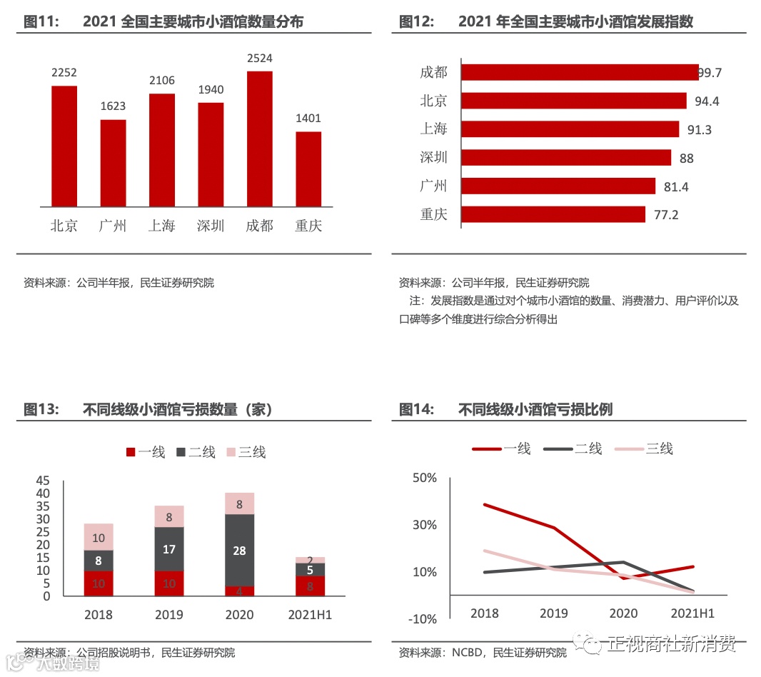 我国一线城市小酒馆发展较为完善,竞争激烈,下沉市场为后续扩张带来增量空间。从目前数量分布来看,我国成都小酒馆的数量是最多的,为 2524 家,其次是北上 深广一线城市,分别为 2252 家、2106 家、1940 家以及 1623 家。根据 NCBD小酒馆发展指数,成都位居首位为 99.7,其次为一线城市北上深广,发展指数均 超过 80。根据海伦司的经营数据,一线城市酒馆的亏损率最高,酒馆数量占比较 大的非一线城市亏损率反而相对较低,2019 年,一线、二线、三线及以下城市海 伦司酒馆亏损数量分别为 10 家,17 家,8 家。