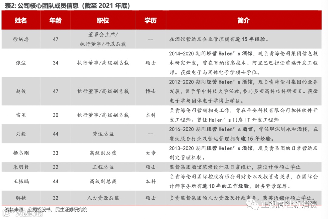 另有 4 名核心团队成员曾亲自经营海伦司酒馆,管理实操经验丰富,对海伦司经 营发展的认识更为清晰。高管普遍拥有高学历背景,团队成员有高校任教、阿里巴 巴前端开发、平安科技软件开发等职业履历,在酒馆运营、信息技术、人力资源、 公司财务等方面背景深厚,专业实力强,综合素质高。