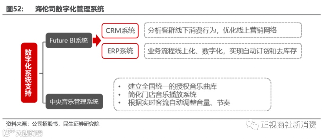 ➢ FutureBI系统:海伦司自有的商业智能管理系统,融合ERP系统和CRM系统。ERP 系统帮助实现酒馆运营、产品销售和营销活动的自动化,收集整合关键经营数据(如产品销量、顾客到店时间等),促进营销精准化、存货管理自动化。CRM 系统根据顾客个人特征精准推送线上营销信息, 提升顾客消费可能性。