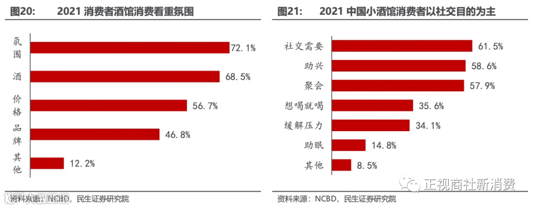年轻客群饮酒观念逐渐趋向健康微醺,低度酒市场发展前景广阔。根据网易数读, 小酒馆目标客群以年轻人为主,消费者去酒馆消费更看重氛围、酒、价格、品牌等 因素,超过 60%的消费者酒馆消费目的为社交,助兴/聚会分别占消费目的的57.9%/58.6%。因此,能提供优质环境、服务和适当价格产品的酒馆能够满足年 轻客群对于氛围、社交消费目的及合适性价比酒饮的要求。