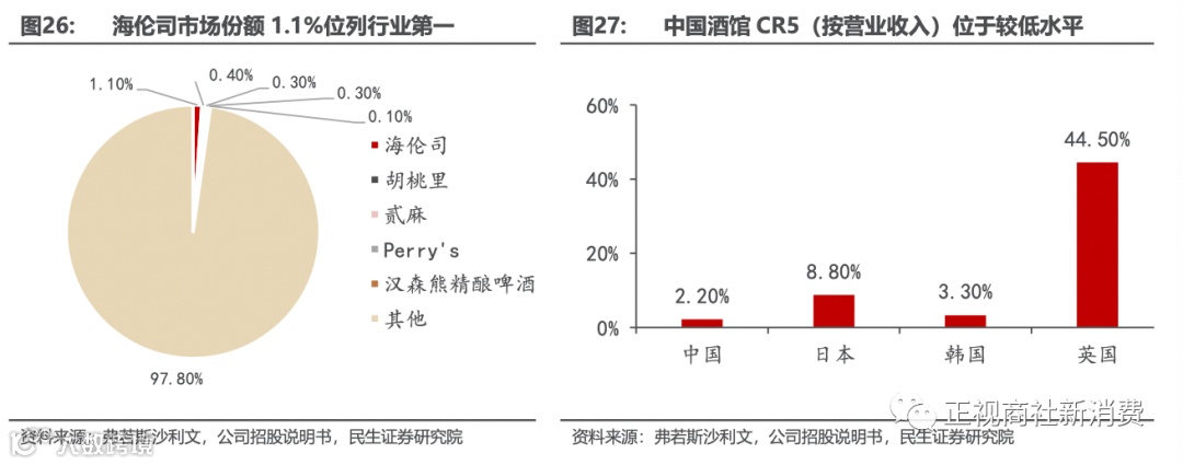 对比成熟酒馆市场,我国小酒馆连锁化率低,龙头连锁酒馆行业整合空间较大。从 市场集中度来看,2020 年我国酒馆行业 CR5(按营业收入)仅为 2.2%,与日本、 韩国和英国的 8.8%、3.3%和 44.5%仍存在较大差距。我国酒馆行业分散,长尾效 应显著,超 95%为独立酒馆(门店数量少于 3 家)。连锁酒馆中,海伦司市场份额 达 1.1%,位列第一, 为 2-5 名四家市场份额之和。疫情期间,缺乏资本和可复 制能力的独立酒馆大量退出市场,而标准化经营、品牌力较强的龙头连锁酒馆海伦 司应对风险的能力更强。随着数字化管理系统、餐饮供应链基础设施等持续升级以及连锁化加速拓店,头部酒馆海伦司市占率有望提升。