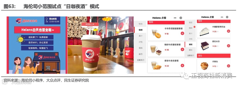 海伦司部分门店开始尝试“日咖夜酒”模式,有望打造全时段年轻人的线下社交休闲空间。为尝试打破夜间酒馆的时空局限性,门店白天售卖咖啡、烘焙、沙拉等简食,提供办公、自习、休息场所。在延长营业时间、增厚酒馆营收的同时,强化用 户链接,日间新业态有望带来广阔成长空间。