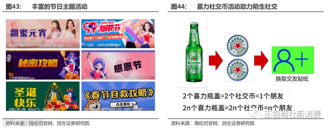 开展丰富的节日活动,强调酒馆社交属性。海伦司店内提供拼桌服务,为有社交需 求的年轻消费者创造跨桌社交的条件,通过举行元宵节、感恩节、万圣节等节日相 关主题活动,提高消费参与感,创造陌生社交的可能性,同时也活跃了店内气氛。顾客消费满一定金额即可免费获得扑克、骰子等游戏用品,在提升服务体验的同时 提供消遣娱乐环节。2021 国庆期间门店推出“喜力社交币”活动,集齐两个社交 币(喜力啤酒瓶盖)可获得一张交友贴纸,用于互换社交信息,助力陌生社交破冰。