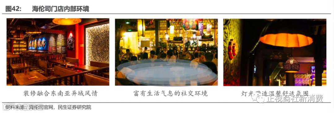 装修融合异域元素,营造温馨氛围感。海伦司酒馆店面主打东南亚风情元素,与创 始人早期在老挝的创业经历有一定关系,辅以欧洲花园,欧式爱丁堡风格,以新颖的装修满足年轻群体对社交氛围感的需求,深化品牌印象。店内桌椅、雕纹装饰采 用木质材料,富有生活气息,整体色调以红、黄为主,灯光偏暖橙色,为顾客营造 惬意温馨的消费氛围。