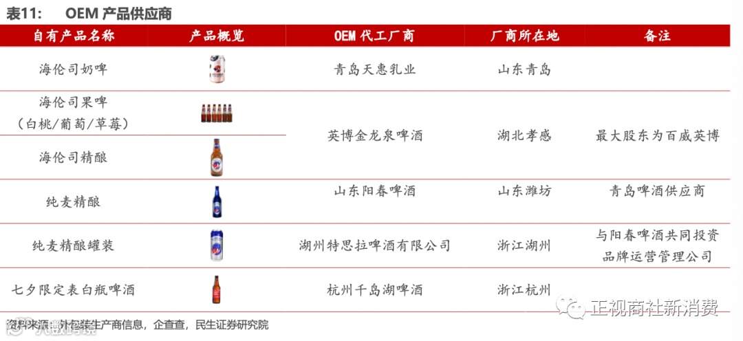OEM 供应体系成熟,加深品牌壁垒优势。海伦司自有酒水采用 OEM 定制生产, 通过需求订单、厂房入股、代工返点等多元化的方式与厂商进行合作,目前与青岛天惠乳业、英博金龙泉啤酒、山东阳春啤酒三家公司建立稳定的长期供应关系,根据市场平均,230ml-260ml 的酒饮出厂价可压低至 2 元以下。同时,OEM 酒水代工在门店规模方面存在壁垒,起订价格高且有数量门槛,通常要求订购 200 箱以上起订。海伦司在门店消化能力和仓储管理方面具有显著优势,可稳固代工模式发展,小酒馆市场其他品牌如 Perry’s、贰麻等均未建立自有 OEM 产品供应链。考虑到啤酒保质对储存、配送条件存在一定限制,海伦司门店聚集性分布于山东、华中、华东沿海等厂商所在区域就近接收产品,未来有望通过铺设全国性供应链加速品牌扩张。