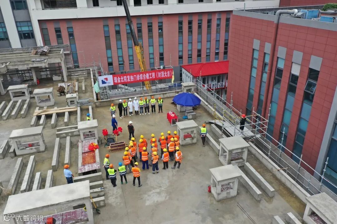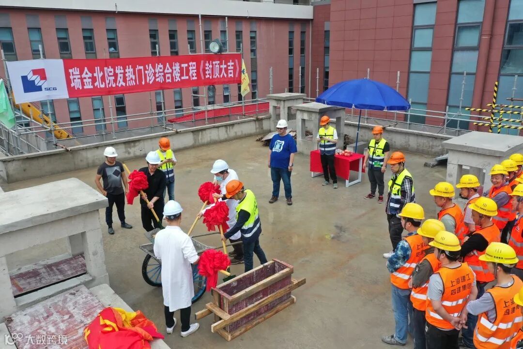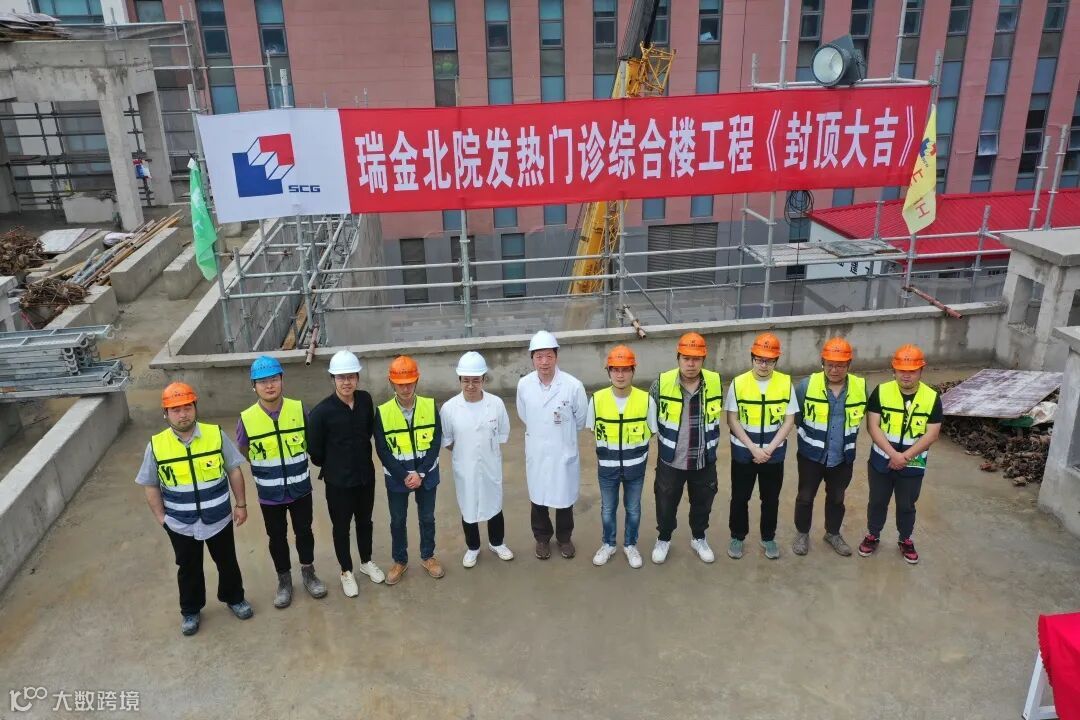 2021年5月12日上午,瑞金北院发热门诊楼项目现场举行主体结构封顶仪式,伴随着最后一方混凝土浇筑完成,瑞金北院发热门诊楼完成主体结构封顶,开始转入二次结构、幕墙施工,装饰装修及机电设备安装阶段,预计2021年7月全面竣工。