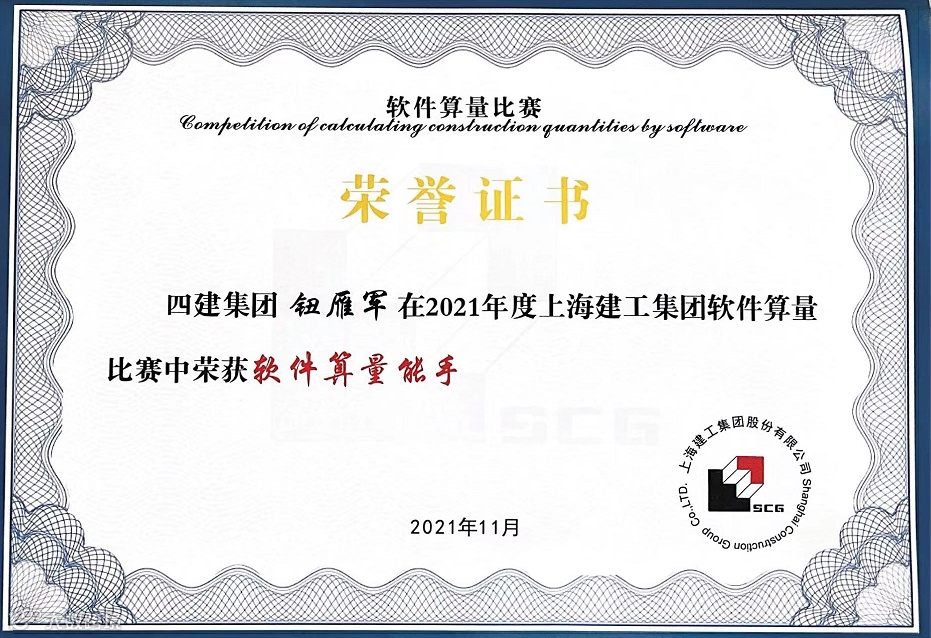 2、工程公司钮雁军获2021年度上海建工集团软件算量能手