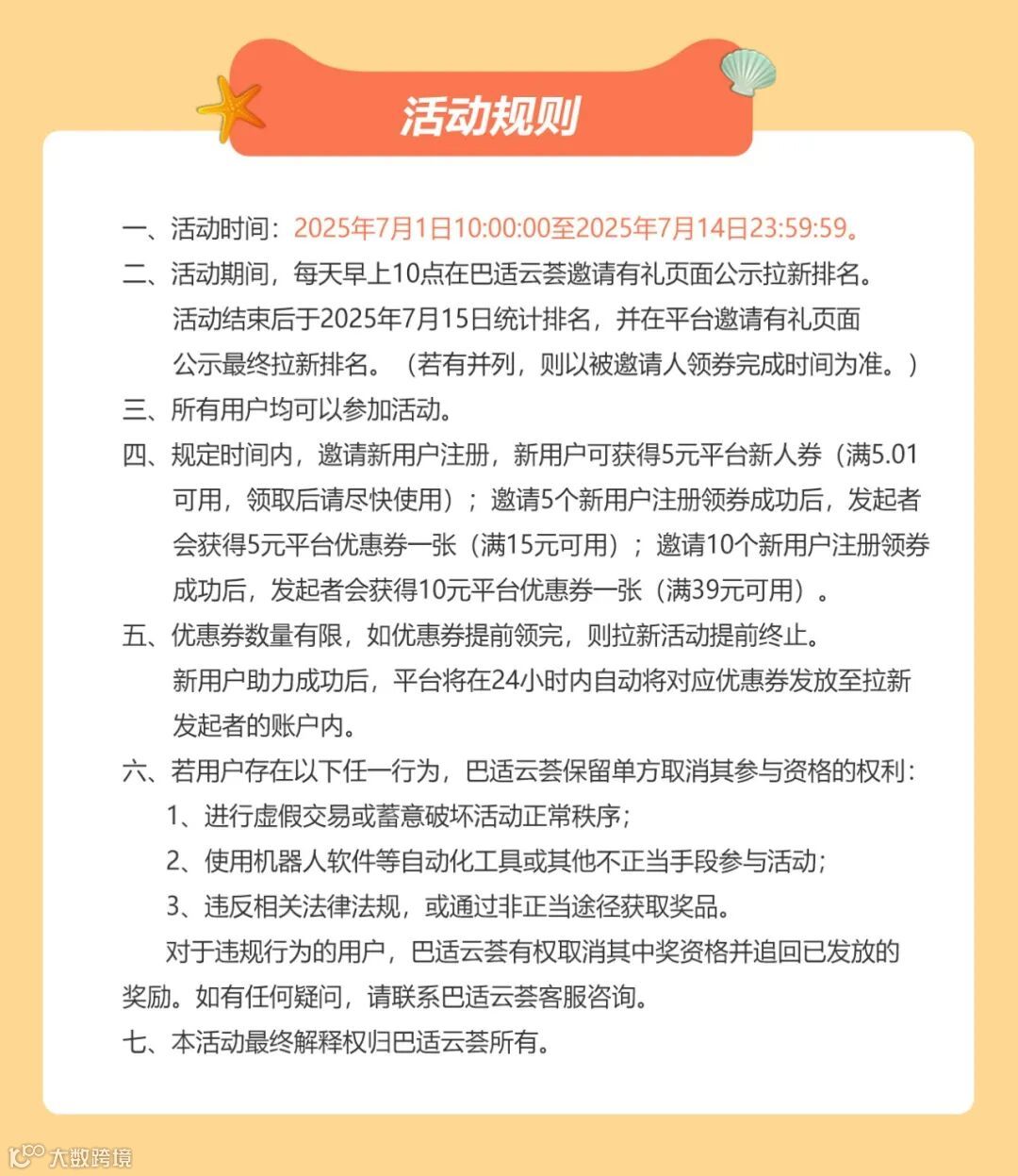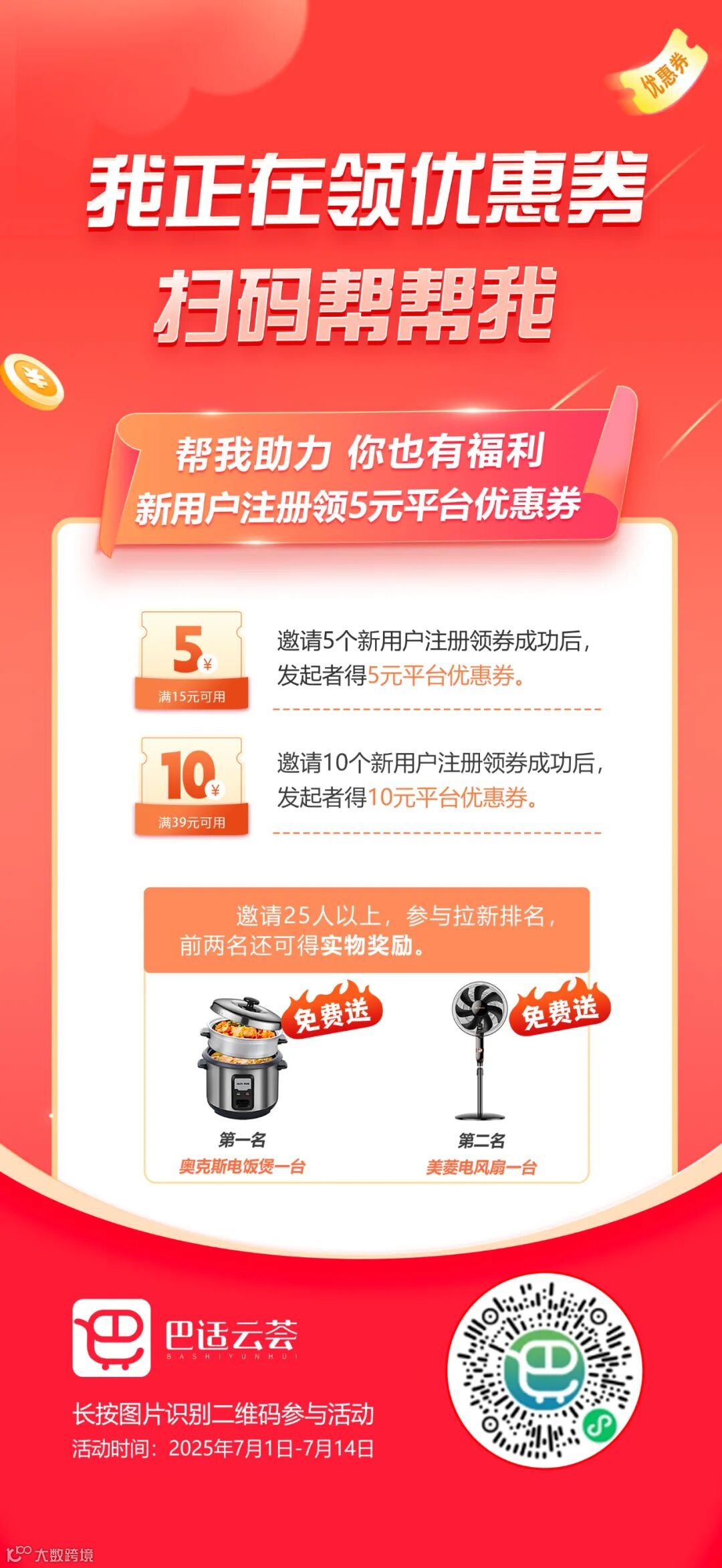 即日起-7月14日,通过分享巴适云荟邀请有礼专属链接邀请好友(限新用户),被邀请人点击邀请有礼页面领取奖励,成功人数达标则发起者获得对应阶梯优惠券奖励,累计邀请人数前两名还可免费领家电。