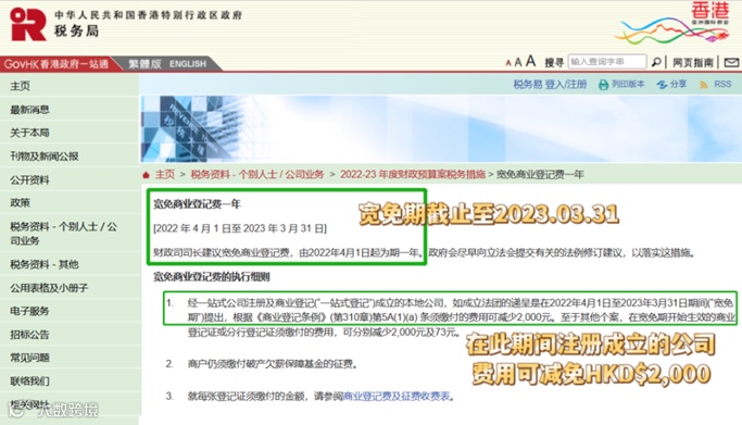 在2022-23年度财政预算案中,香港财政司司长建议免除2022-23年度的商业登记费。根据《2022年收入法令(减少商业登记费及分行登记费)》,该政策将于2022年4月1日开始实施,有效期为一年。在此期间,注册成立的公司可以减免2000港币的商业登记费用。该宽免政策将于2023年3月31日截止