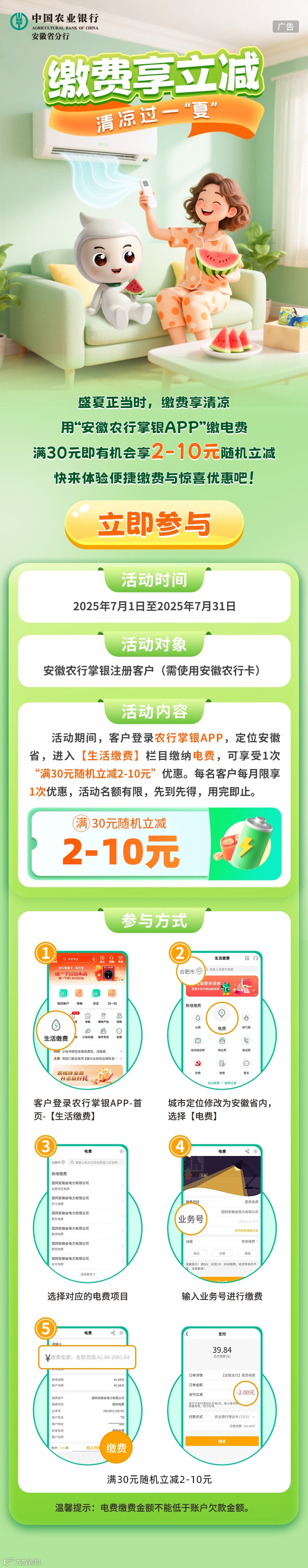 【电费缴纳】满30随机减2-10元,用安徽农行掌银APP超“减”单!