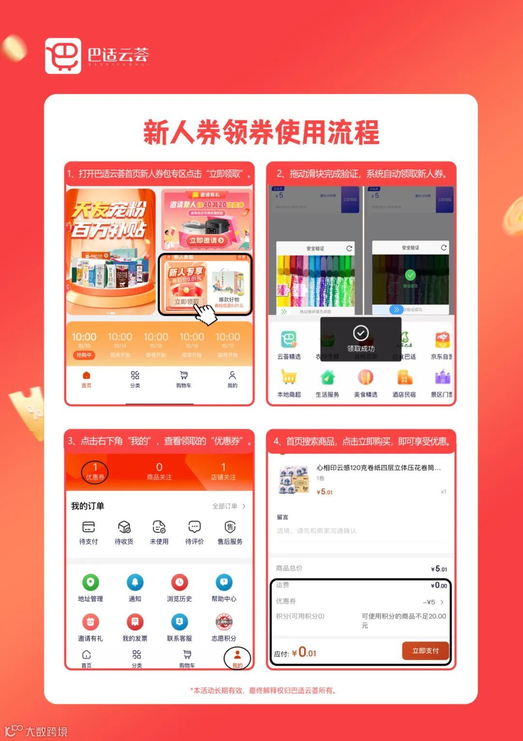 在巴适云荟小程序新人专享页面,用户可领取5元无门槛新人注册优惠券。