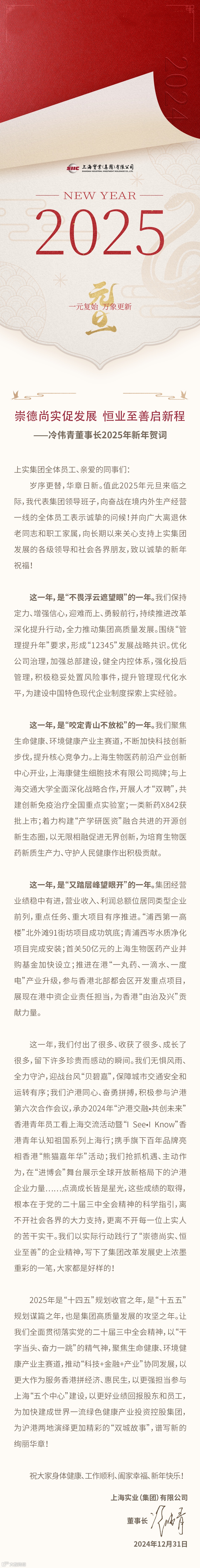 崇德尚实谋发展,恒业至善启新程!上实集团冷伟青董事长2025年新年贺词