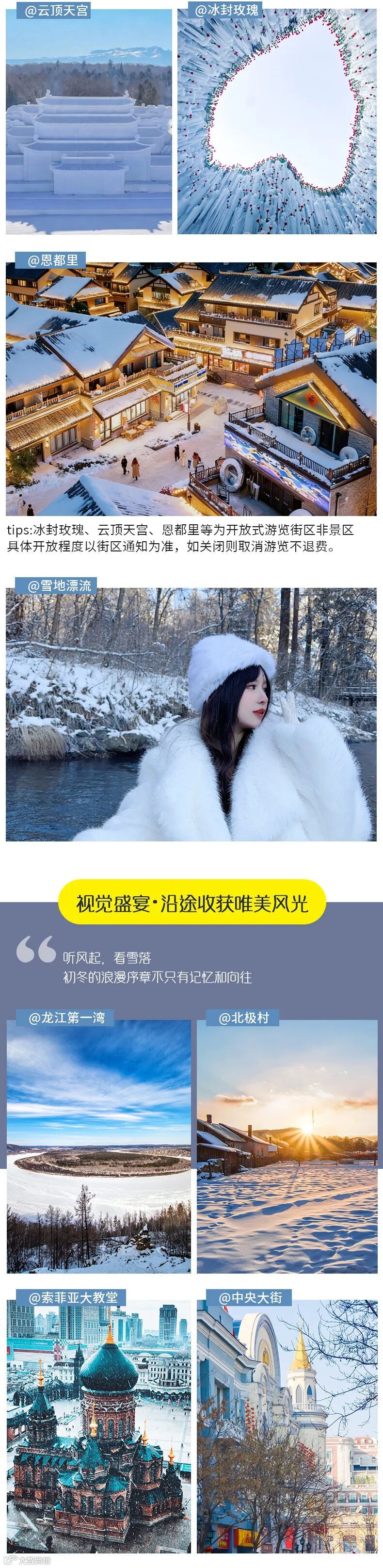 3、 冰封玫瑰、云顶天宫、恩都里为开放式游览街区非景区,具体开放程度以街区通知为准,如关闭则取消游览不退费