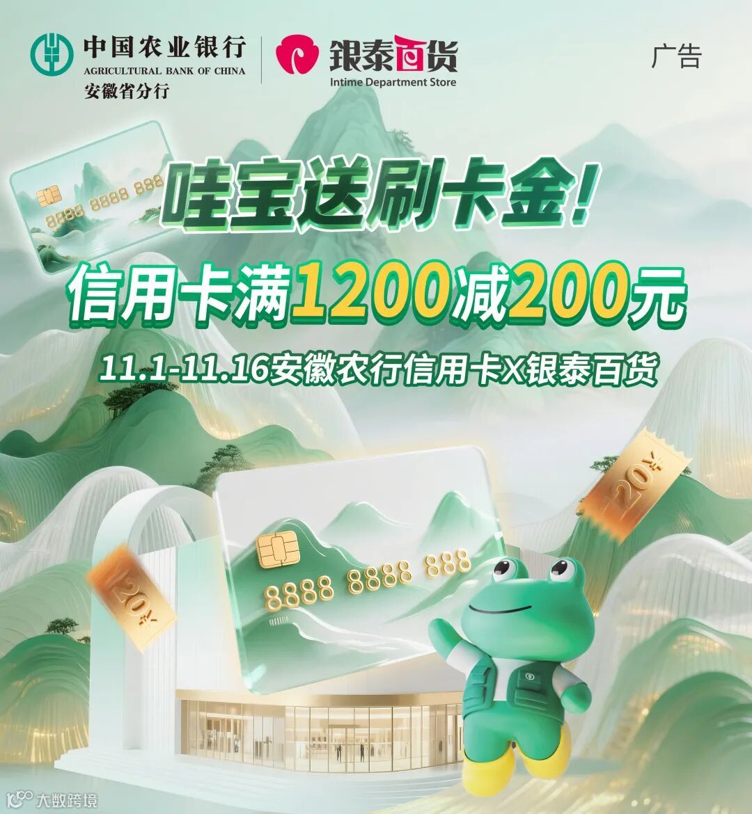 活动期间,顾客至安徽地区银泰百货线下统一收银百货专柜消费,使用云闪付绑定安徽农行信用卡,享受单笔实付满1200元减200元,每天100个名额,先到先得,活动期间仅限1笔。单人单笔交易仅限享受1次优惠,不可以拆单,投资金不参加活动。