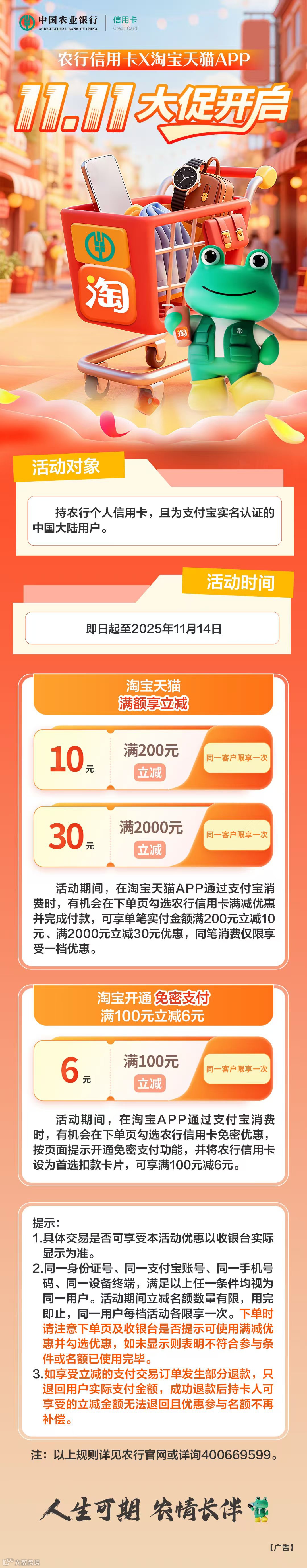 【WOW福利】淘宝11.11大促开启,农行信用卡支付宝消费享立减!