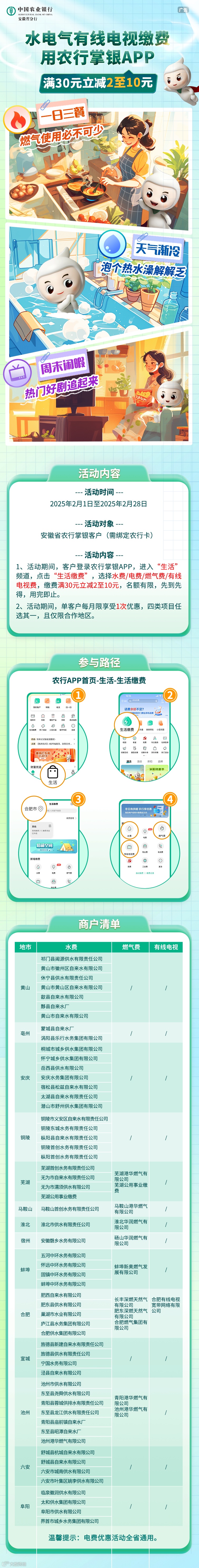 【掌银支付】水费/电费/燃气费/有线电视费,满30元立减2至10元