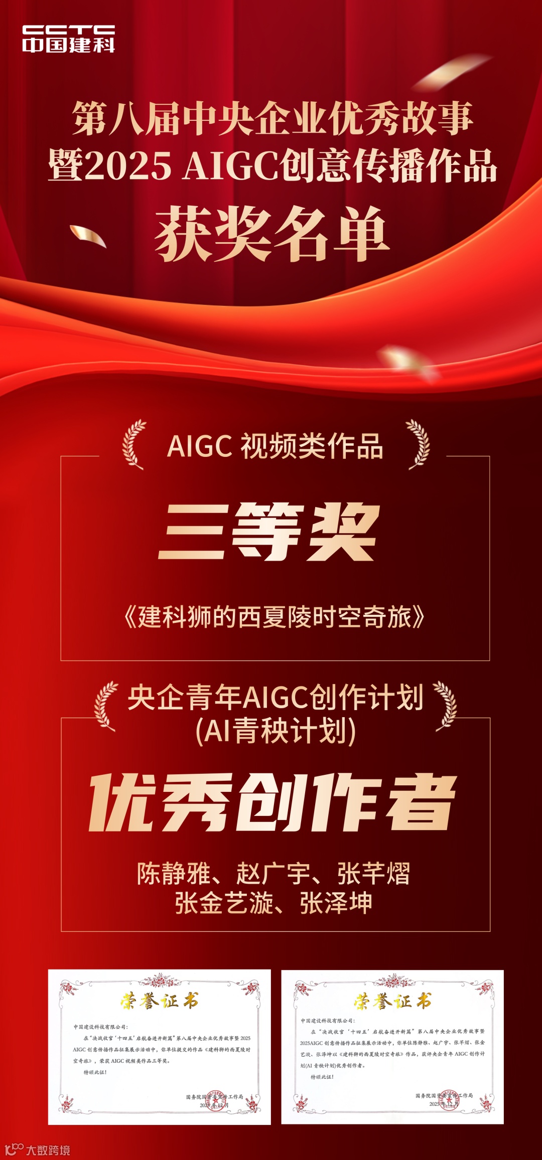 12月10日,由国务院国资委宣传局、中国外文局、人民网联合主办的第八届中央企业优秀故事暨2025AIGC创意传播作品发布展示活动在北京举行。现场发布优秀故事作品、优秀AIGC视频作品、优秀AI+IP形象应用案例等多类荣誉,中国建科选送的1项作品及其创作团队获奖。
