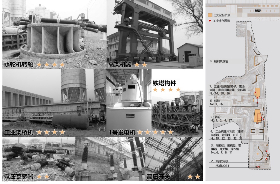 丰满老厂区历经风雨洗礼与岁月磨砺,不同时代的故事与人文精神沉积在多元载体之上。伪满时期的水轮机、民国时期的机组、建国初期的桥机与原生的大树等散落于场地之间,默默地记录着过往。如何唤醒记忆,挖掘场地信息,纪念过往、展望未来是重要的思考点。