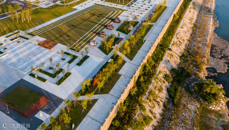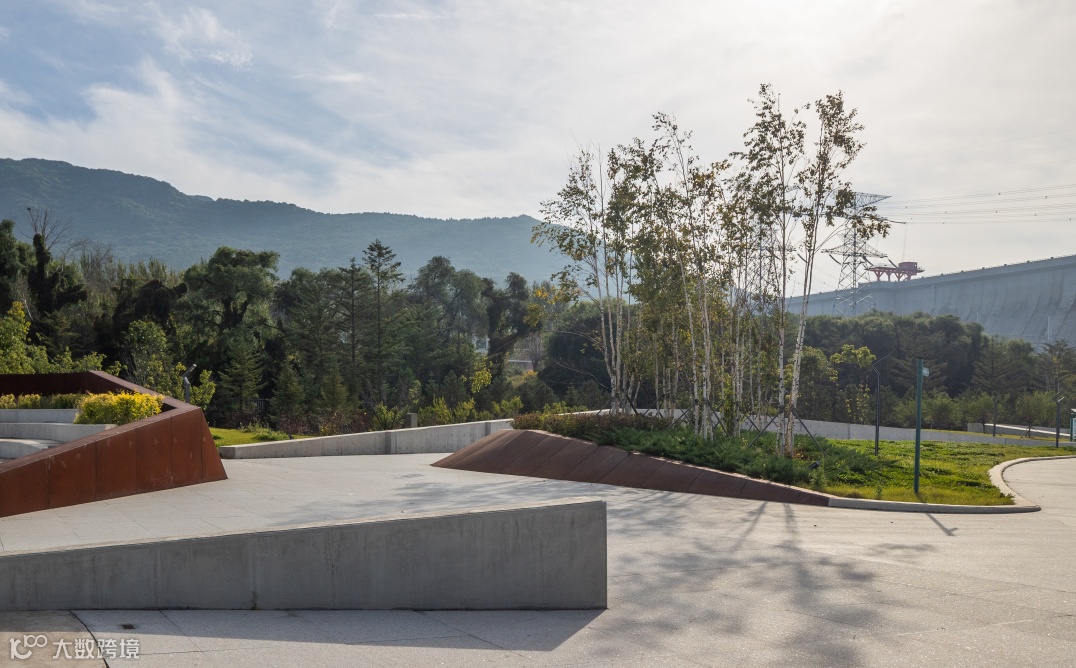 设计团队提出“大地纪念碑”的设计概念,以简洁朴素的大地景观手法,于大地之上雕刻出强有力的几何形体,使新建景观与恢宏的人工坝体、广袤的地域环境之间建构适宜性关联;在协调多个宏大元素尺度间平衡的同时,统领多元景观风貌,共同编织出雄浑壮阔的山河图景。
