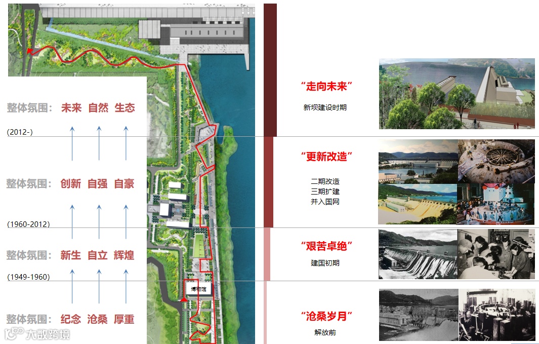 “沧桑岁月”段是参观的起点,以超长弧形锈板墙引导游览,以此表达伪满时期劳工被时代洪流裹挟于漩涡之中随波逐流的意向,鲜花点缀的白桦林是对那段历史的默默哀悼;“艰苦卓绝”段则展现建国初期一片崭新的天地,收集不同时代水轮机重组而成的“时代标尺”嵌入徐徐升起的草坪,镌刻燃情岁月于开阔昂扬的地景之上;“更新改造”段则以保留老建筑桁架作为中心,同时以折形展墙引导观者到达最佳观坝点,以此表达自主研发阶段的精神传承与曲折历程;“走向未来”段是对今日建设成就的讴歌,也是对历史的铭记。具有造型力度的悬挑平台与大坝交相呼应,恢弘的景观对话跃然眼前。展示新坝建设新材料、新技术、新工艺的景墙将观者引至老坝遗址区。将部分老坝遗址进行保留展示,与新坝隔水相望,形成世界唯一“一址双坝”奇观,历史与未来相拥相守。