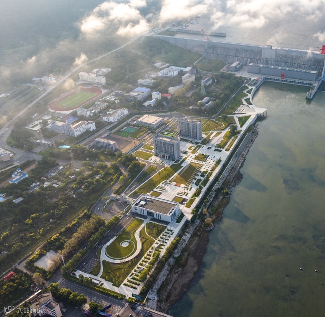 在景观的宏观视野下,设计团队将大坝、建筑、工业设施等诸多要素视为景观系统的一部分进行综合统筹。从“大景观”视角规划自然景观与人文景观,使其建立互为因借的相生关系,形成人工与自然山水相互依托的和谐整体。并以此理念为纲领对园区总体进行一体化设计,包括总体规划优化、坝体及水工设施风貌优化、办公及生产建筑方案设计,以及涵盖园区环境景观、艺术小品、生态修复、夜景照明、标识系统等在内的总体设计。