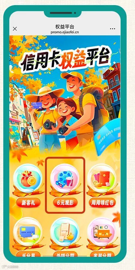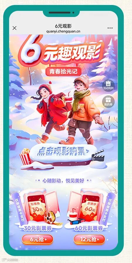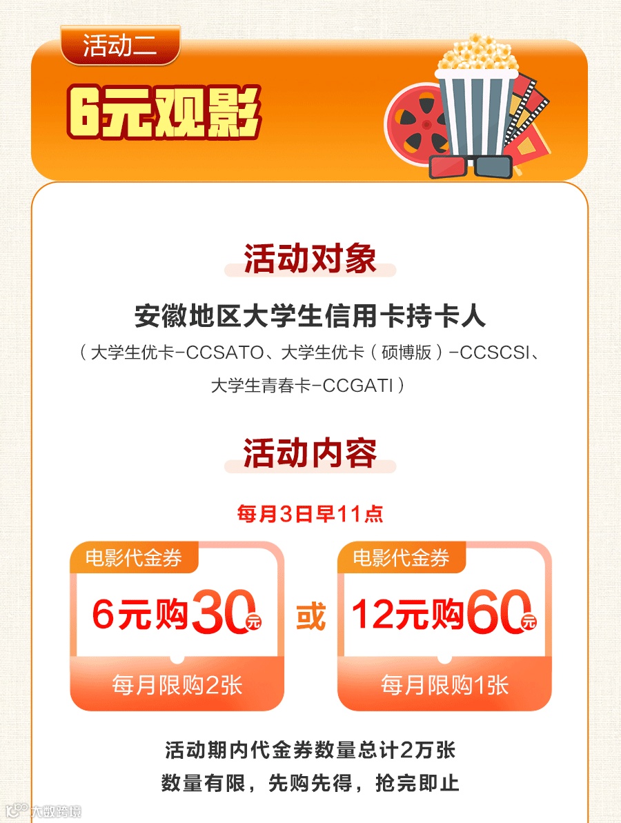 2、用户选择信用卡支付享受6元购30元电影代金券(每月限购2张,如选购30元以下的电影票,代金券不找零一般适合1人观影),12元购60元电影代金券(每月限购1张,如选购60元以下的电影票,代金券不找零,一般适合2人观影),以上两种代金券同一客户仅能选择一种购买,客户可根据自身观影人数情况进行选择。