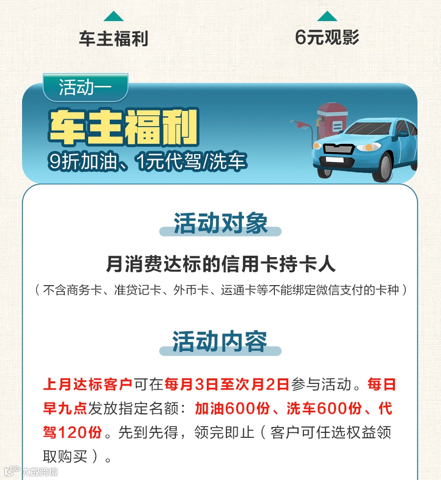 1、持卡人名下信用卡月消费满2000元可于次月领取3次权益,月消费满1000元可于次月领取2次权益,月消费满500元可于次月领取1次权益。持卡人可在洗车、代驾、加油3种权益中任选,权益次数每月清零,未领取视同放弃,不结转至次月。