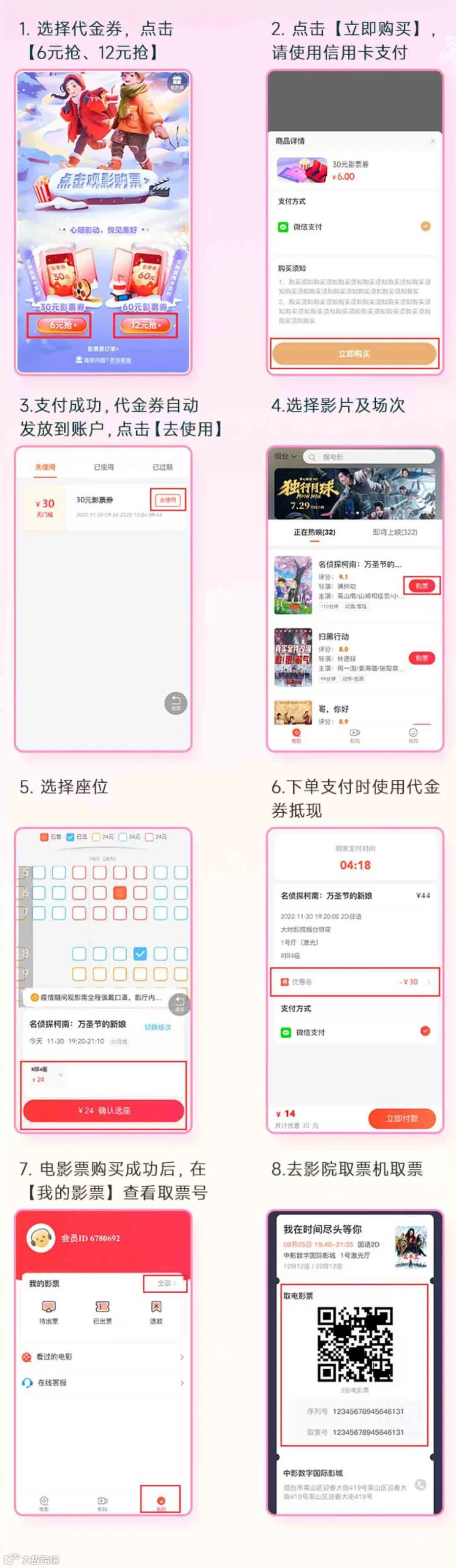 4、线上购票流程:选择代金券-立即购买-选择信用卡支付代金券自动发放到账户-去使用-选择安徽地区影院购票选座-代金券支付-查看影票。