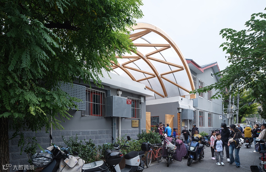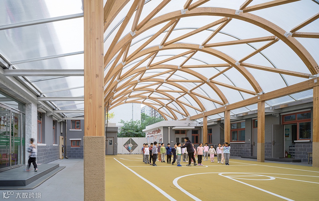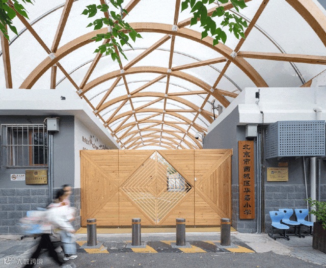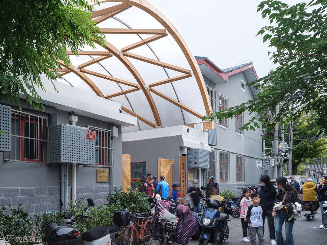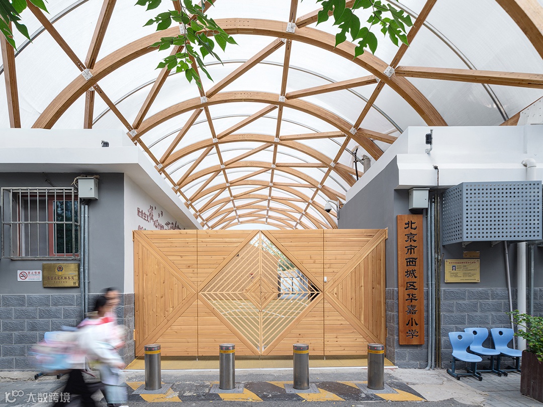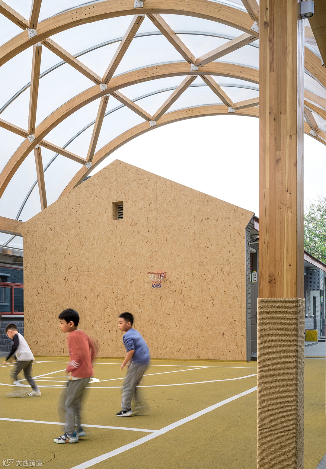 为了解决雨天在餐厅、教学楼、办公楼之间的自由穿行的问题,中国院项目团队制作了一个木制的拱顶,同时拱顶下的空间也变成了风雨操场,让同学们能够自由活动,无拘无束。弧形拱顶还被延伸到胡同边界,让家长能够从校外就感知到学校的“庇护”。由此,胡同的自由穿巷与学校的公共活动场地实现了有机衔接,同时,巨大的弧形拱顶也充满生气地对传统的胡同提出了新的意向表达。