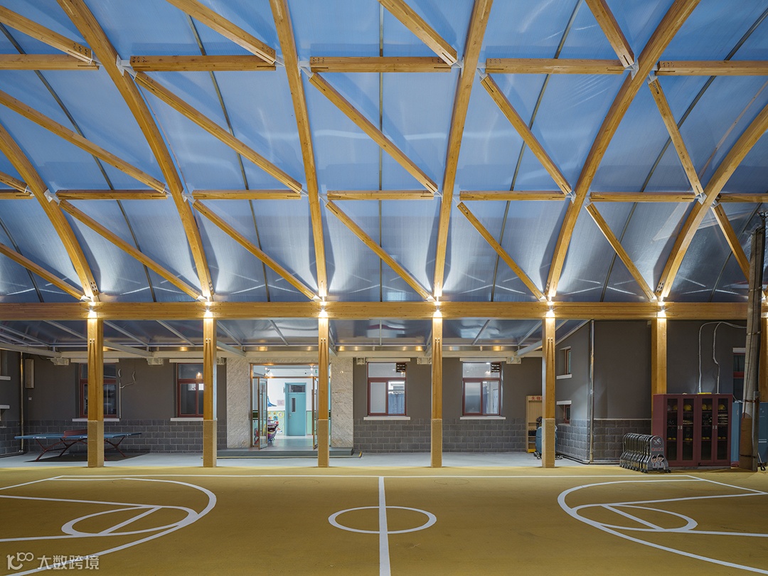 在学校内部,原本在雨天无法使用的庭院,摇身一变成为在任何时候、任何天气都可以使用的活动场所,学生在此空间既可以自由休憩,也可以跟随老师锻炼身体。屋面的阳光板为拱下提供充足的光照,温暖的木色为原本灰色的冷清的空间提供新的有趣体验。一个充满生气、温暖如春的空间,在传统四合院建筑中熠熠生辉。