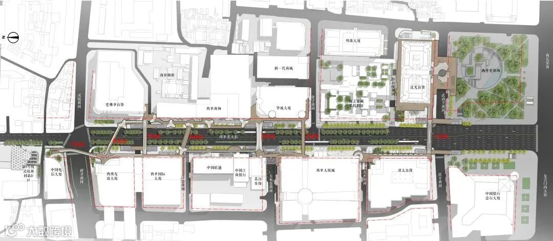 复合利用东西两侧桥下消极空间,设置两组建筑单元,将原来散布在街道上的公共服务设施(便民警务站、城管执法站等)收纳其中,在楼梯下方增设绿化休憩空间,更新大街地面铺装,形成整齐有序的街道环境。