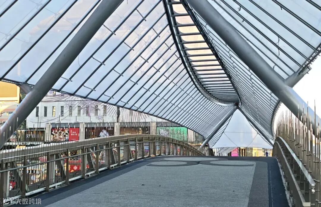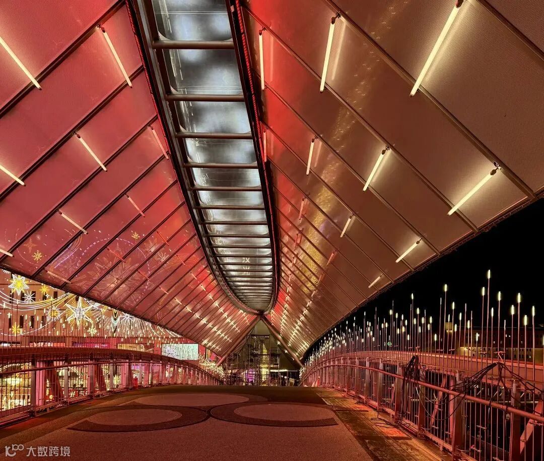本次更新改造保留现有结构及自动扶梯,在满足桥体结构要求的前提下,将桥面及楼梯踏步面层铺装材料更换为更防滑平整的EPDM橡胶颗粒,解决既有桥面的积水问题;新增轻质索膜结构棚架,为行人提供遮阳避雨的通行路径;桥侧新增种植槽、提高护栏高度,通过这些措施有效提升桥面通行的安全性和舒适度,使其达到与现代商业街区相匹配的公共空间质量。